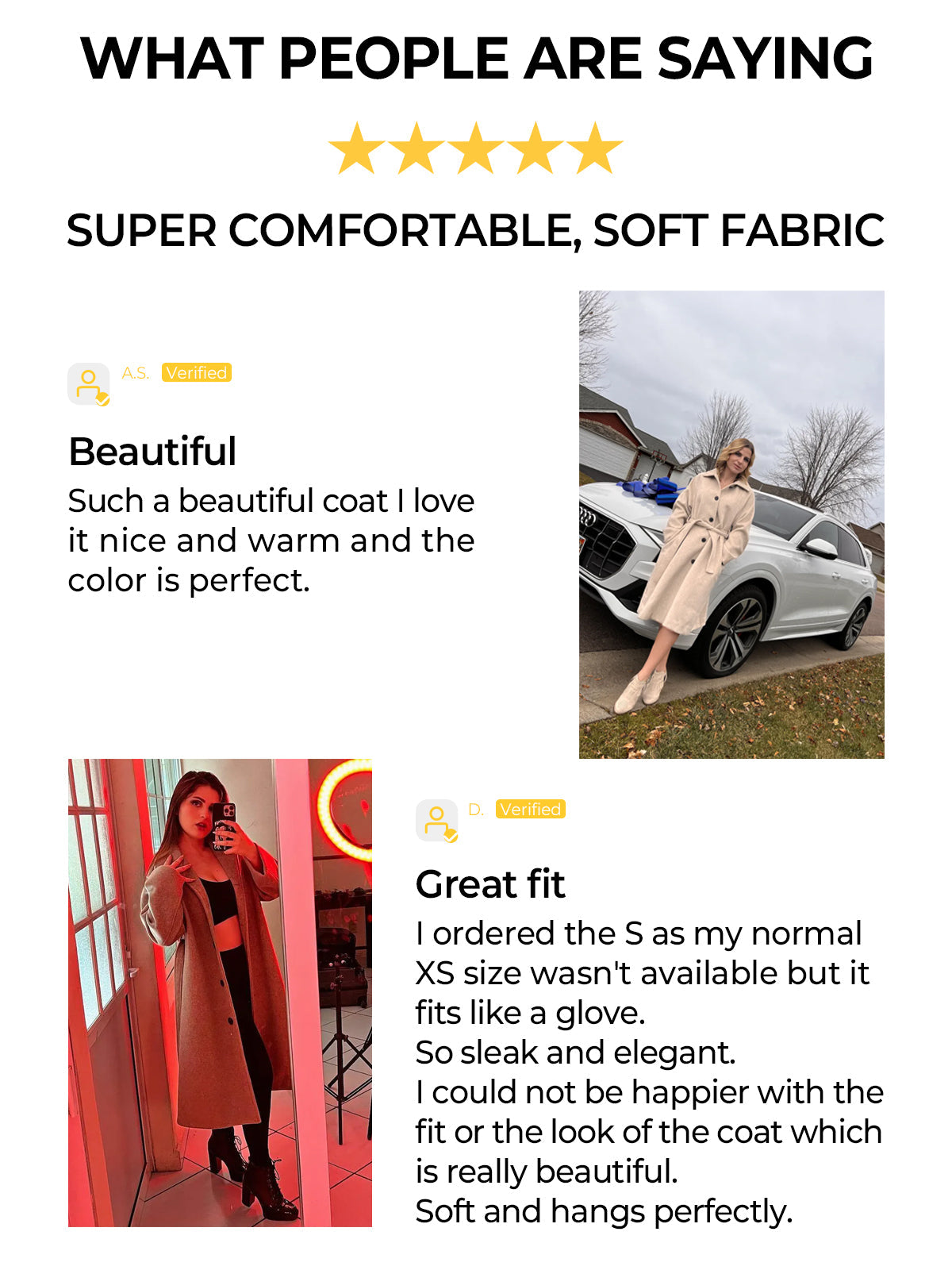 ✔️ Wolmix houdt je warm op koude dagen ✔️ Verstelbare ceintuur voor een vrouwelijke taille ✔️ Lange, rechte pasvorm voor een elegante look ✔️ Zachte binnenkant voor extra comfort ✔️ Tijdloos design dat makkelijk combineert